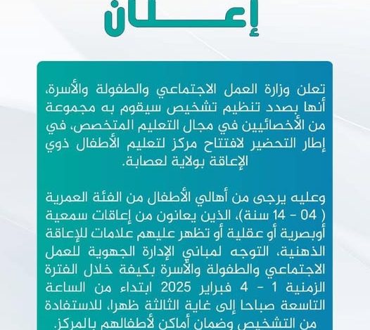 أعلنت وزارة الطفولة عن تنظيم حملة لحصر وتحديد الاحتياجات التربوية للأطفال ذوي الإعاقة الخاصة في ولاية لعصابة، خلال الفترة من 1 إلى 4 فبراير 2025، بما يسهم في تعزيز إدماجهم في النظام التعليمي وتوفير الخدمات التي تناسبهم.