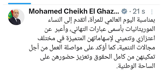 “بمناسبة اليوم العالمي للمرأة، أتقدم إلى النساء الموريتانيات بأسمى عبارات التهاني، وأعبر عن اعتزازي وتثميني لإسهاماتهن المتميزة في مختلف مجالات التنمية، كما أؤكد على مواصلة العمل من أجل تمكينهن من كامل الحقوق وتعزيز حضورهن على الساحة الوطنية”.